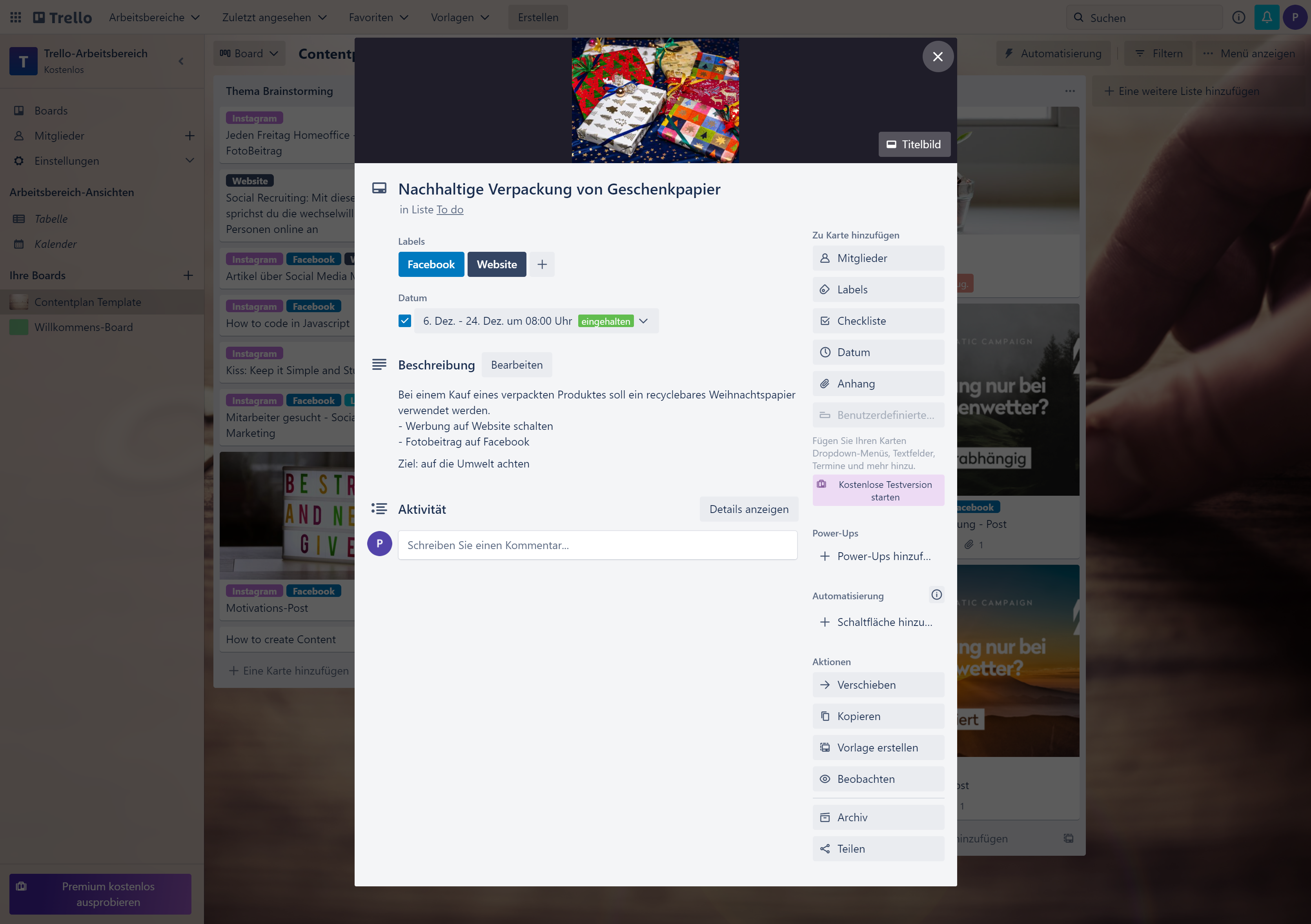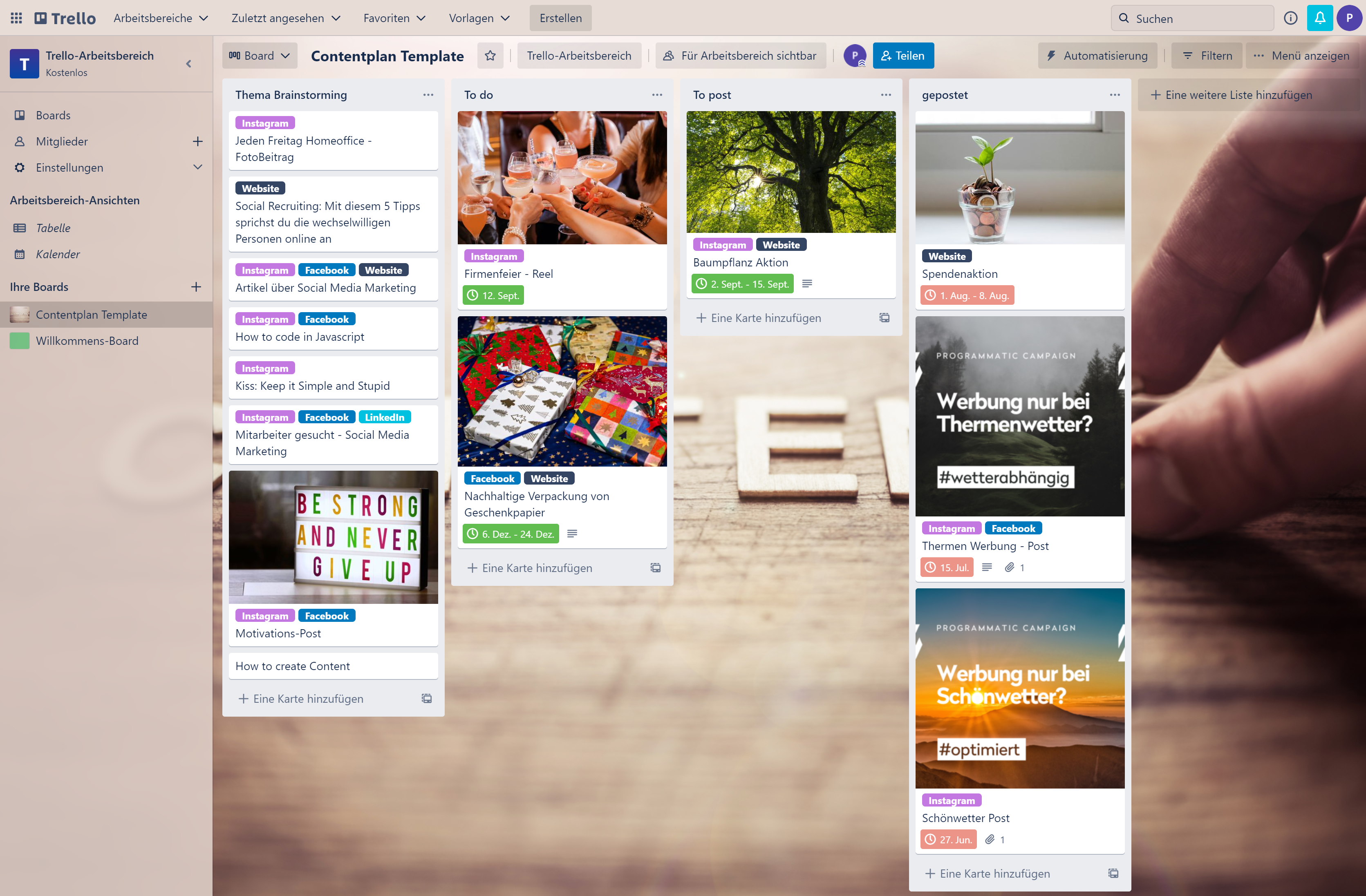 Trello bietet hierbei viele nützliche Funktionen und macht es somit einfach die Beiträge zu ordnen und die Übersicht darüber zu behalten, wo noch Inhalte fehlen, welche Posts in der Pipeline sind, oder wer vom Projektteam welchen Beitrag bearbeitet.